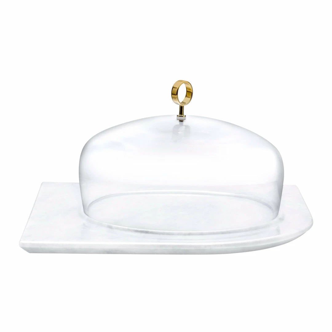 This NUDE Cupola cake dome is crafted from clear lead-free crystal topped with an elegant brass handle and set atop a solid marble base. Available in three sizes, this one is large.