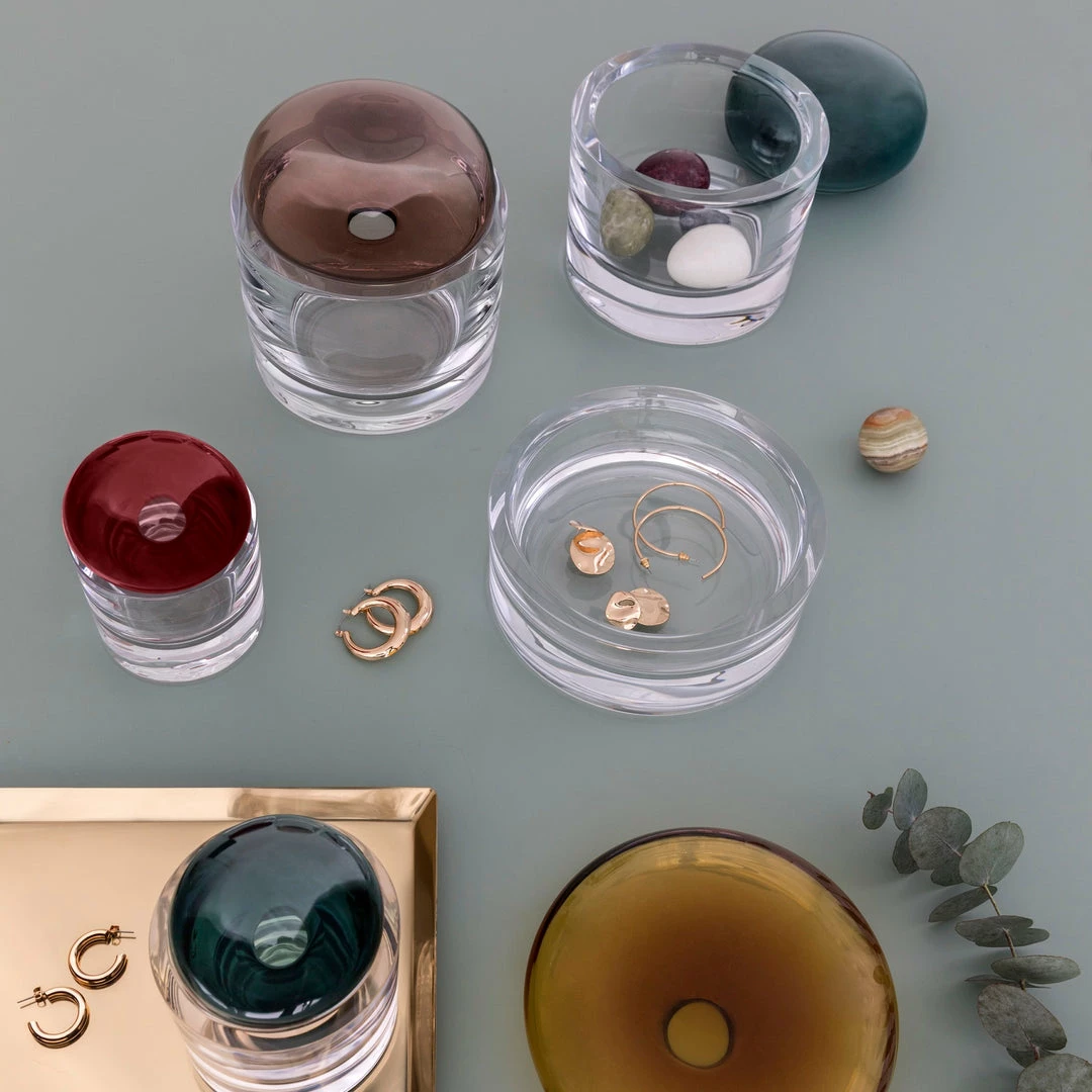 This small NUDE Ecrin container is practical and chic in equal parts. Designed by Sebastian Herkner, the collection draws inspiration from the Earth Pyramids of Ritten β an impressive natural monument in South Tyrol. Crafted from a combination of clear and colour-infused crystal, the containerβs commanding, heavy base contrasts beautifully with the smooth shape of the lid. A precious piece to store precious items.