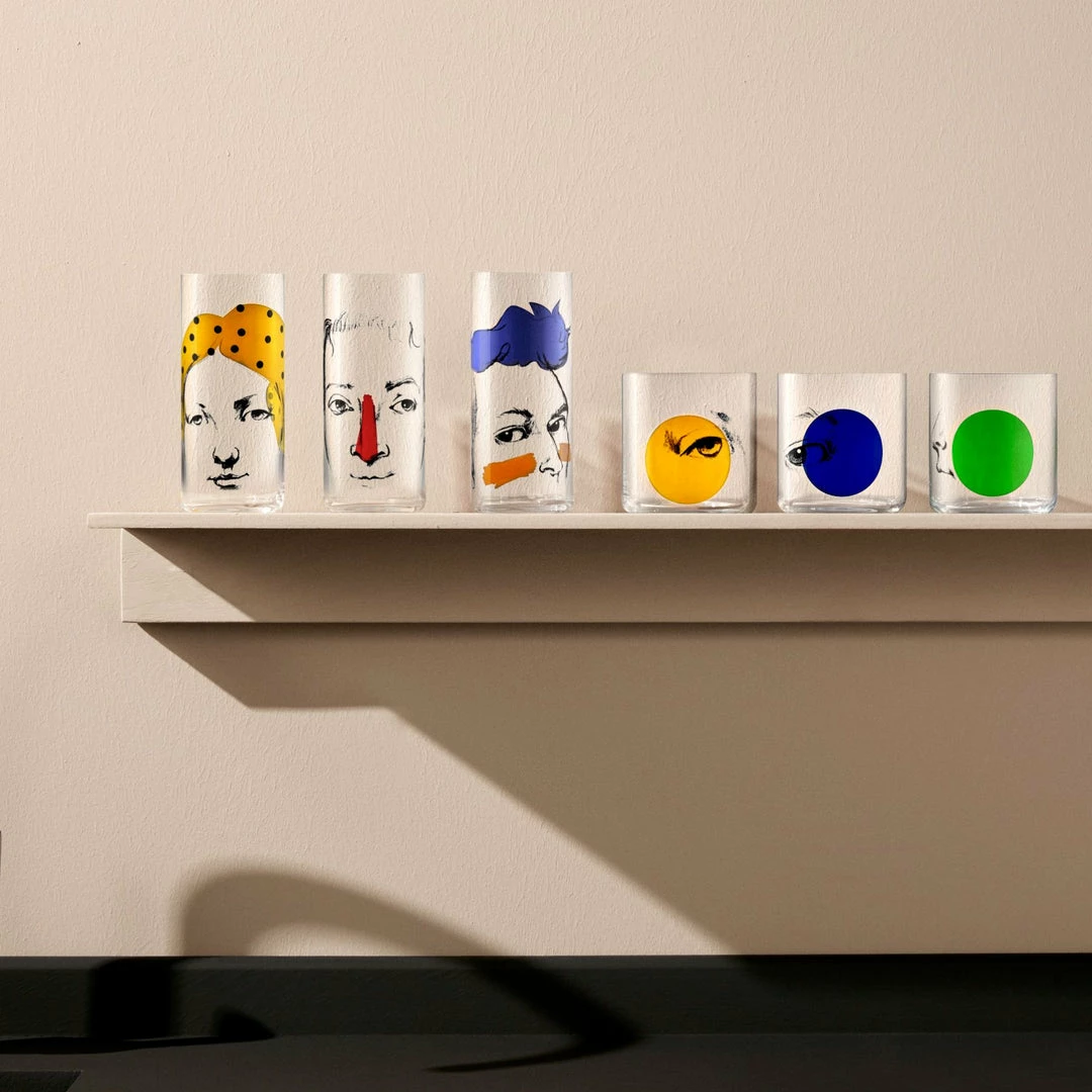 A playful spin on the NUDE Finesse glasses β this unique edition is decorated with a series of brightly hued face motifs created by the graphic designer and illustrator Umut Karaman as part of the NUDE Rock & Pop Artist collection. Sculpted from lead-free crystal and presented in a set of four, theyβre perfect for pairing with other pieces from the range for an explosion of colour and creativity.
