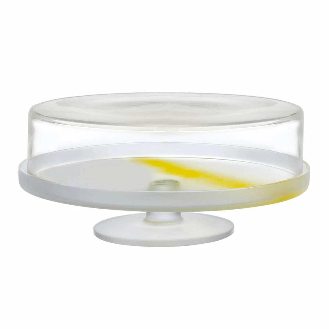 This NUDE Pigmento cake dome is at once functional and sculptural. Comprising a clear crystalline dome atop a distinctive base infused with flashes of colour, this beautifully crafted piece presents subtle variations and unique characteristics, owing to the special pigmentation technique, where the pigment is sprayed by hand onto the finished product with a yellow accent — previously mouth-blown and sandblasted for a one-of-a-kind, deeply modern look.